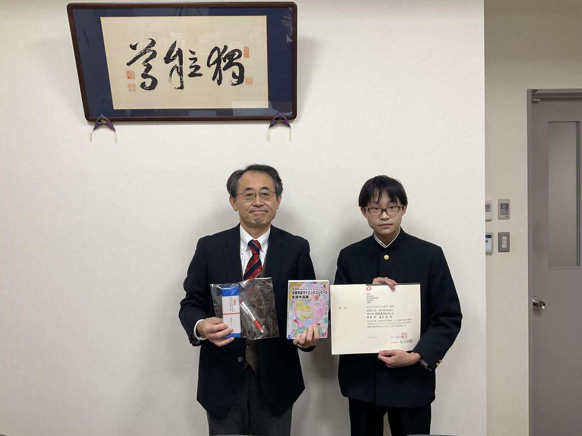 第69回全国学芸サイエンスコンクール(主催:旺文社)自然科学部門において、本校の桑原朝君(2年)が「色が変化する葉の植物色素と光合成」に関する研究により、旺文社赤尾好夫記念賞を受賞しました。 桑原君の植物に対する深い探求心と日々継続してきた努力が、今回の受賞につながりました。
