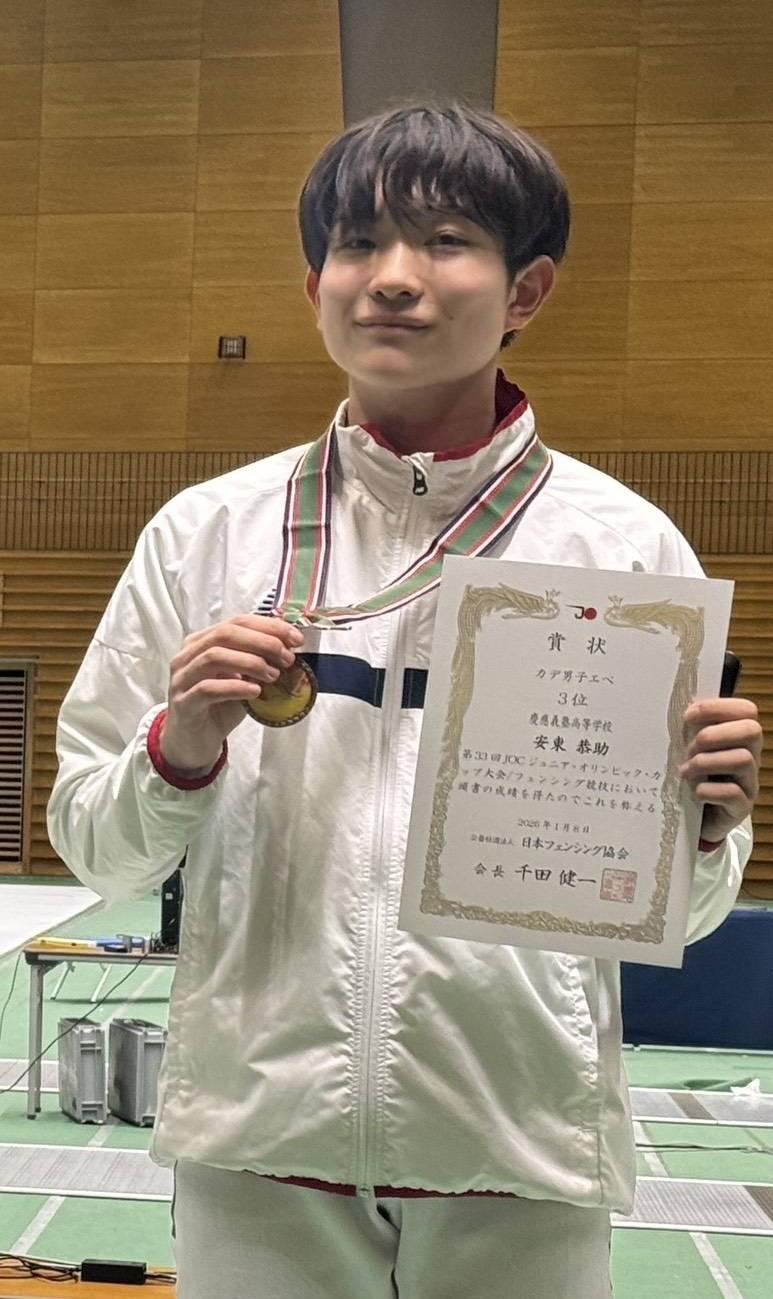 1月8日(木)〜1月11日(日)、駒沢オリンピック公園屋内競技場で行われたJOCジュニアオリンピックカップ大会において、安東恭助君(2年)が出場し、エペ種目カデ部門で3位となりました。